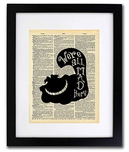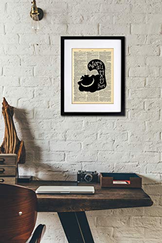 Alice In Wonderland Cheshire Cat Silhouette – We’re All Mad Here – Quote Art – Home or Office Decor – No Frame  – QUALITY VINTAGE DICTIONARY PRINTS – Focusing on making quality prints for the Home & Office. This 8×10 print is Ready-To-Frame and will fit perfectly in any Frame with Mat when delivered. Thank You