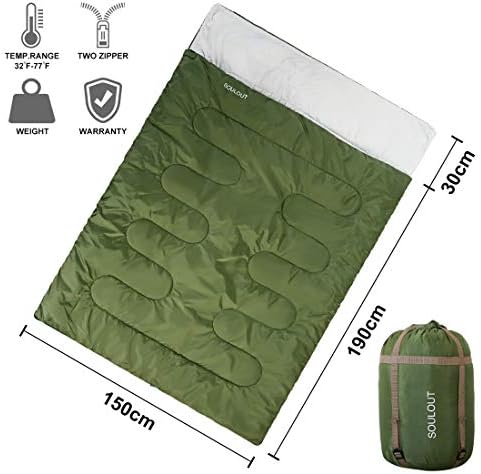 SUPER WARM AND MOST COMFORTABLE – The SOULOUT Waterproof double sleeping bag is perfect for backpacking, camping and hiking. Lined on the inside with a super-soft brushed and filled with 400g /㎡ 3D synthetic fiber fill for optimum warmth insulation. Suitable for spring, summer and fall camping. Measures 59” W x 87” H; fits people up to 6.5’ tall. Provides a queen size roomy experience, similar to sleeping in your own bed at home.