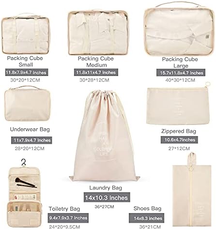 【8 SET PACKING CUBES FOR TRAVEL 】 : One set includes 3 sizes of travel organizers packing cubes( large:10-12 shirts,medium:7-9 Shirts, small: 5-6 shirts), 1 bra underwear bag, 1 Toiletry Bag,1 Shoes Bag, 1 zippered bag, 1 Drawstring Laundry Bag, Easy to pack all your luggage well in your 20”-28” suitcase, carry-on bag, drawers and backpack for short or long trip