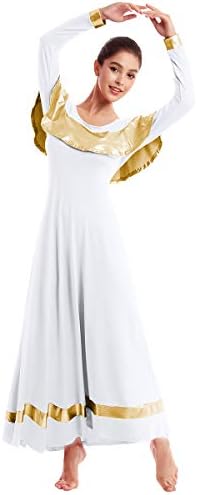 ♣ Shiny metallic bi colour block reward dance attire for girls, distinctive designed with flounce metallic gold distinction colour neck and skirt bottoms, seems to be extra enticing. Elegant and trendy worship gown options lengthy sleeves, lotus leaf neckline, unfastened match, pullover type. Huge swing, offer you sufficient area to maneuver, metallic splice design at neckline and hemline make it extra stunning when dancing or twirling