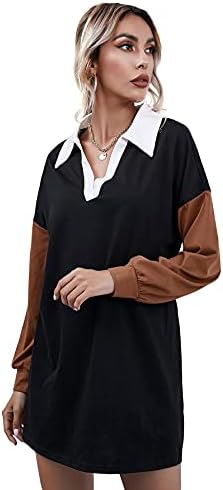 Features: Long sleeve, drop shoulder, v neck collared, long drawstring sweatshirt top, casual colorblock short sweatshirt dress for women